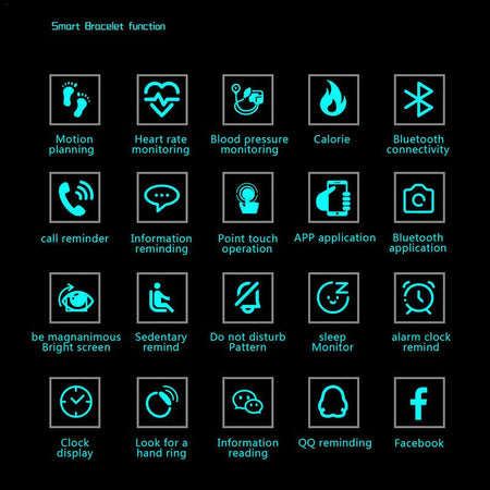 Call reminder, digital display clock, step analysis, sedentary reminder, sleep monitoring, heart rate and blood pressure, two-way anti-lost, Bluetooth push reminder.